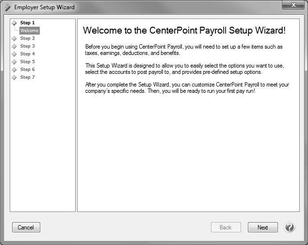 Step 1 - Welcome to the CenterPoint Payroll Setup Wizard