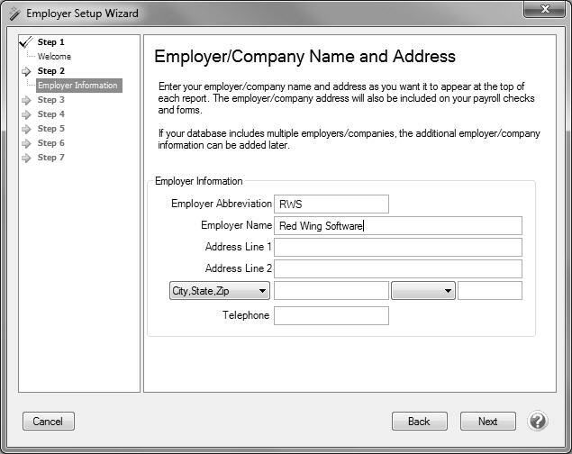 1. Enter your employer/company name and address as you want it to appear at the top of each report. The employer/company address will also be included on your payroll checks, government reports, and W-2 forms. If any of this information is not known, it can be added to the employer later.