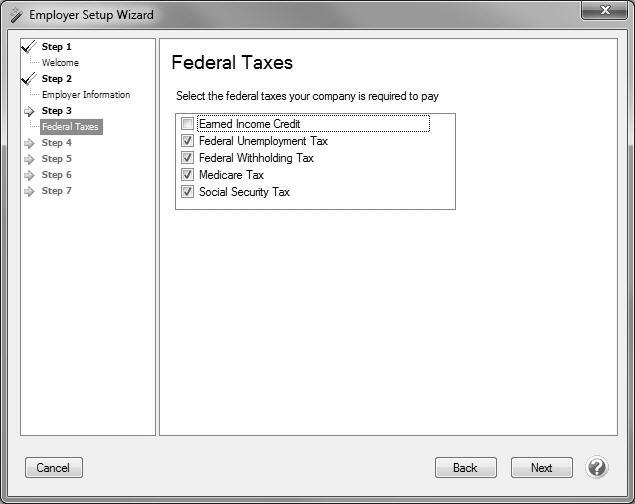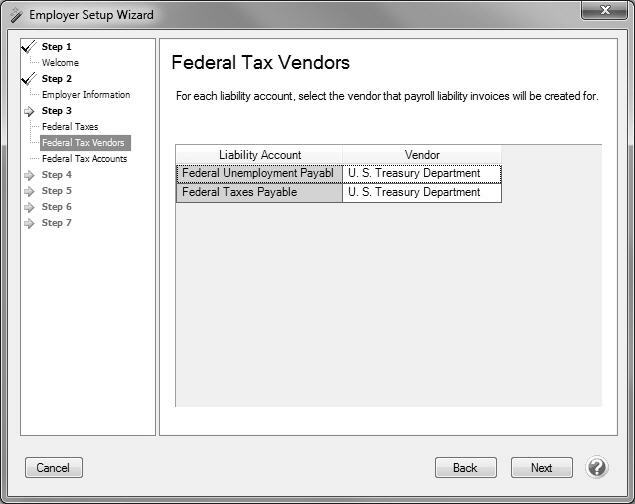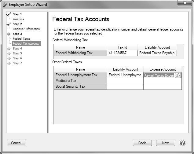 1. Enter or change your federal tax identification number and default general ledger accounts for the federal taxes you selected.