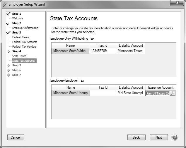 1. Enter or change your state tax identification number and default general ledger accounts for the state taxes you selected.