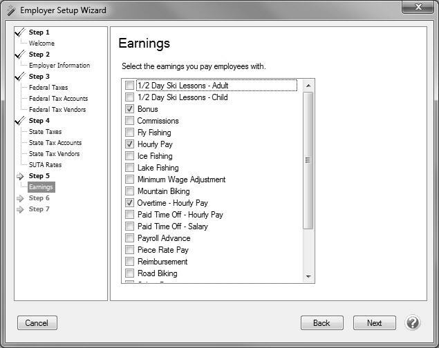 1. Select the earnings you pay employees with. Any additional earnings that are not on this list can be added after you finish the wizard.