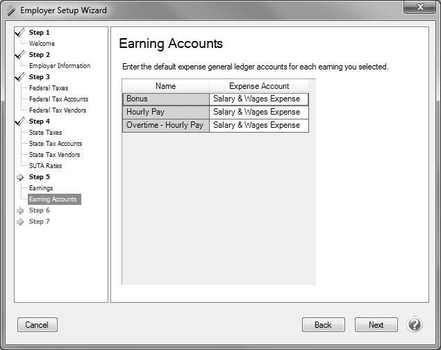 1. Enter the default expense general ledger accounts for each earning you selected.