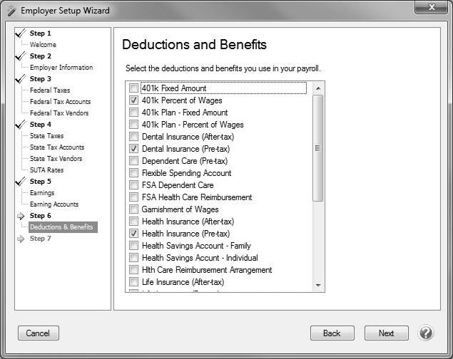1. Select the deductions and benefits you use in your payroll. Any additional deductions or benefits not on this list can be added after you finish the wizard.