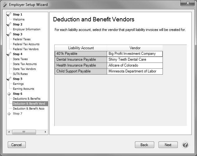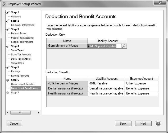 1. Enter the default liability or expense general ledger accounts for each deduction/benefit you selected. Note: The default Liability Account you select must be an account in the Payroll Liabilityaccount category and the default Expense account you select must be an account in the Other Employee Expense or Benefit Expense account category. The same expense account should not be used for a deduction or benefit expense as is used for an earning.