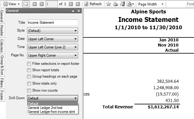 Each report in CenterPoint with drill down capabilities has a default report assigned that it uses to display the information being drilled down to. For example, if you drill down on an Income Statement report, the General Ledger report will be displayed by default.