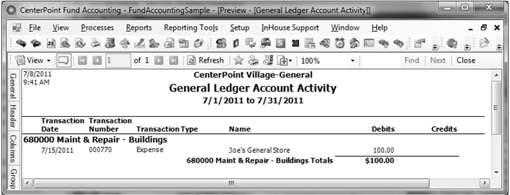 1. Click the Refresh button and the modified report will be displayed. Because the Department column was included, the $100 transaction is summarized by Department instead of by account as shown in the first example.