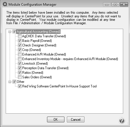 - If the Module Configuration Manager screen displays, click OK. The Module Configuration Manager screen will only display if you are installing CenterPoint for the first time, or if you are installing an update that contains a new module.