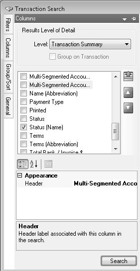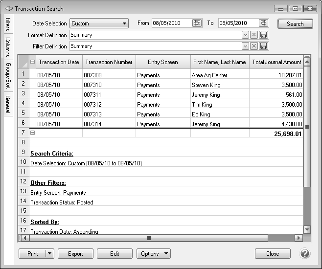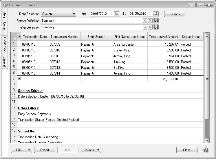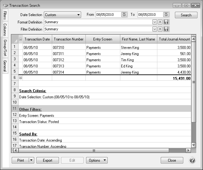 - Select the filters, columns, etc. needed to search for the data you'd like to display (refer to the Transction Search topic for additional information). Click Search. In our example, we have filtered the data to show only Payment transactions dated 8/5/10.