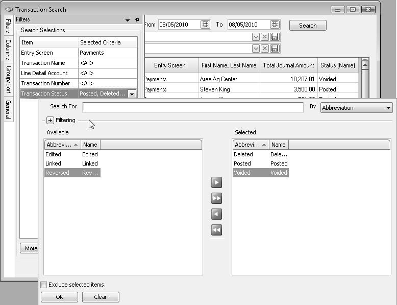 - Select the Filters tab and click in the Transaction Status field. By default, only posted will be selected. Move the appropriate options for your search to the right under Selected. In this example, we moved Voided and Deleted. Click OK.
