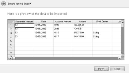 - Click Import. Clicking Cancel will exit you from the General Journal Import screen without importing the data. During the import process, if any data is not acceptable for the field being imported, an error list will be displayed.