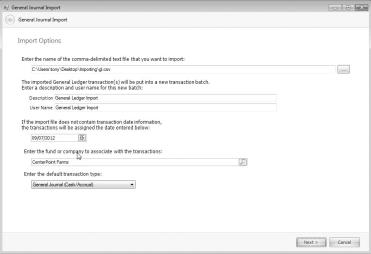 The General Journal Import module is used to import general journal entries from a comma delimited (.CSV) file into CenterPoint. The import will bring the transactions into an unposted batch in CenterPoint Accounting. Once imported it can be edited/reviewed and then posted.