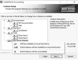 - Select the down-arrow next to SQL Server Express, select Entire feature will be installed on local hard drive, and then click Next until the installation begins. Continue clicking Next until the installation completes.
