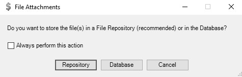 CenterPoint gives you the option of storing your attachments in a file repository or to your database. Red Wing Software recommends using the File Repository, but there are benefits and downsides to both options. Choose the option that will work best for your organization.