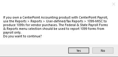 1. If you do not own a CenterPoint Accounting product with CenterPoint Payroll, click Yes at the following Do you want to continue? message. If you do own a CenterPoint Accounting product with CenterPoint Payroll, select Reports > ReportsUser-defined/Tax Reports > a 1099 form to produce 1099s for vendor purchases.