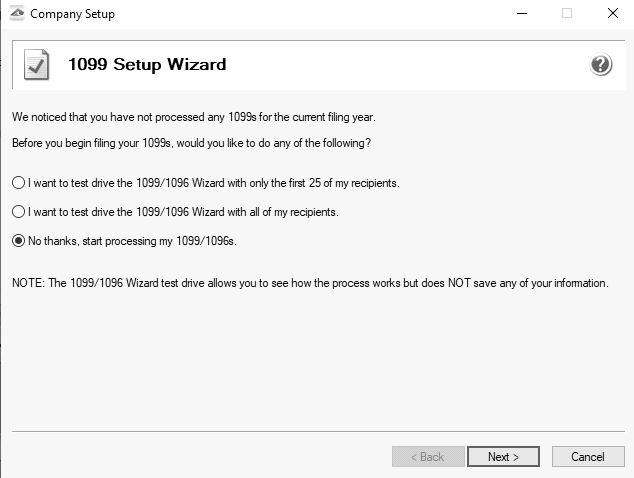 1. If this is the first time 1099s are being processed this year, the 1099 Setup Wizard will automatically be displayed. If you want to continue the 1099 process, select the No thanks, start processing my 1099/1096s option, and then click Next. If you wish to test the 1099 Setup Wizard without saving any of the test information, select either the 25 recipients or All recipient test drive options. (The test drive allows you to see how the process works but does not save your selections, changes, or forms.)