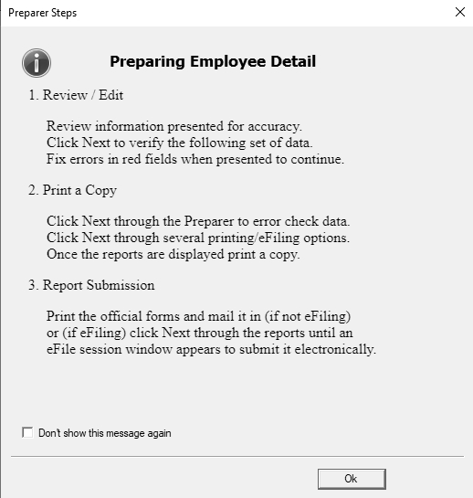 The W-2/1099 Preparer will walk you through the process of eFiling and/or printing your 1099s. Once the displayed data has been reviewed, click Next to continue to the next screen. When you click on Next, the W-2/1099 Preparer will automatically verify that all required fields are filled in and the data is formatted correctly. Anytime the Preparer finds data that is incorrect or missing, it will automatically prompt you to correct it.
