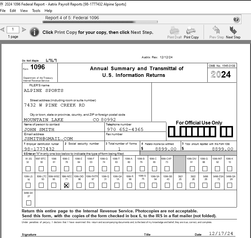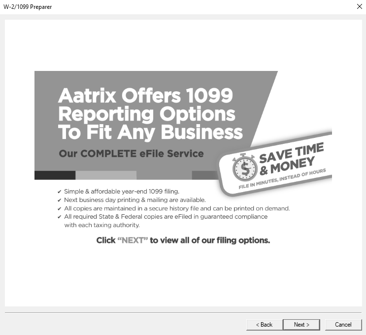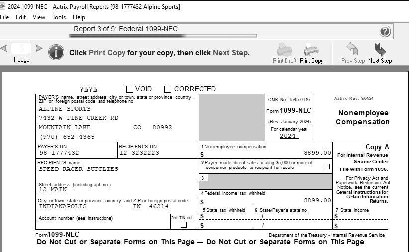 Note: If you choose to use the Complete 1099 eFiling Service through Aatrix, you do not need to print any 1099 forms.
