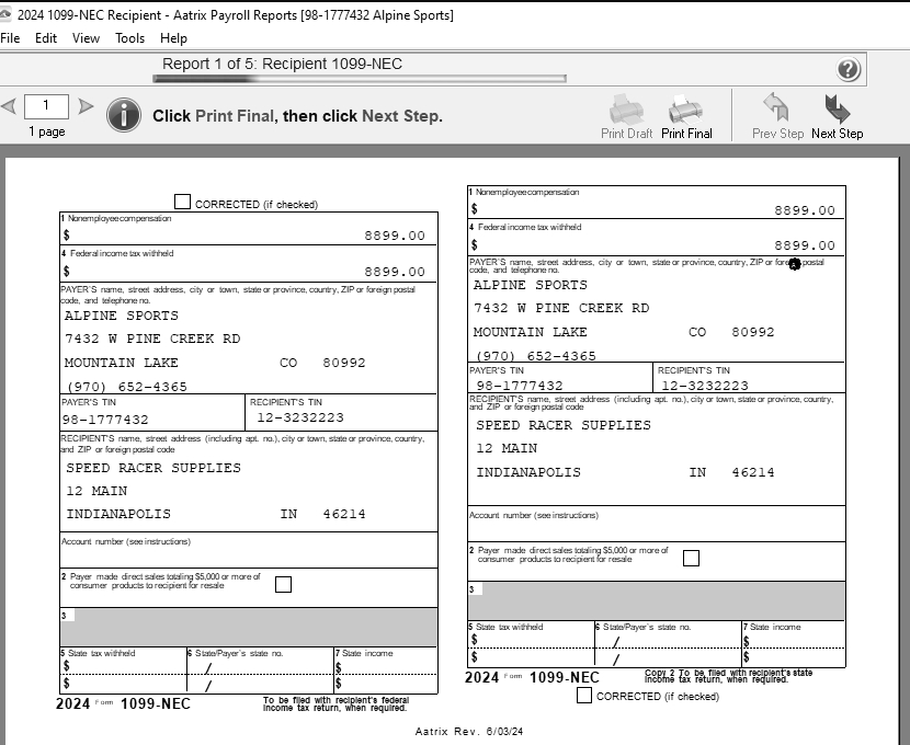 • To print this first form, click Print Final. You will be prompted to enter either plain paper or perforated paper. Click OK. Once the data is printed, click Next Step to continue to the next selected form.