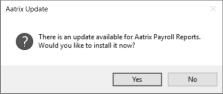 If you have internet access and the latest version of Federal/State Tax Forms (Aatrix) is not installed, the following Aatrix Update screen will display when you select the menu selection above.