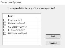 1. The Correction Options screen will display and ask you questions based on the status of your original W-2 process. The following screen shot is an example screen that will display. Answer the questions that display and then click Continue.