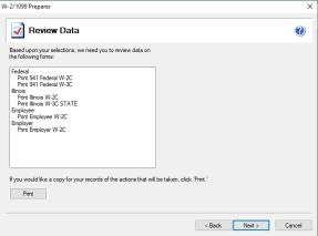 • When you have completed all changes, click Next Step, the Divider Sheet screen will display and then the Review Data action list will appear. The action list is created based upon the type of W-2 copies previously completed, what was changed in the W-2 Preparer, and the current status of the eFiling. All this information is compiled through the software to determine what needs to be completed for the corrections made.