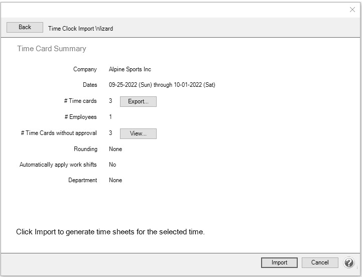 - When the Time Card Summary screen is accurate, click Import.