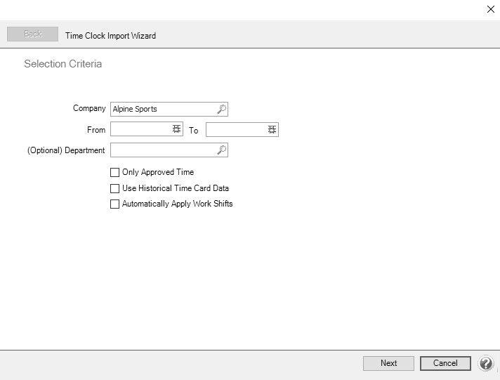 - Select the Only Approved Time check box to only import time cards that have been previously approved by a supervisor. If this check box is not selected, all time cards in the selected date range are imported.