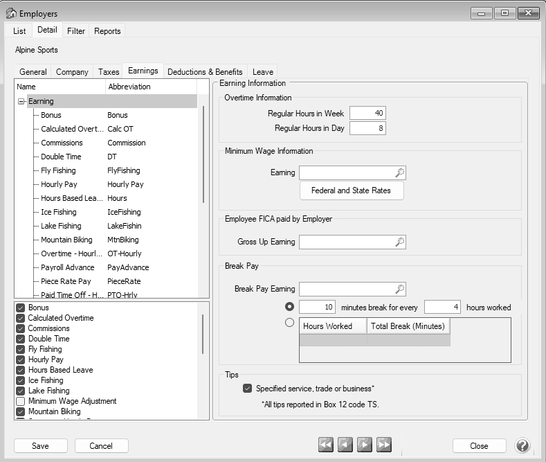 4. In the Break Pay section, select the new earning that will be used to pay piece rate employees for their breaks.