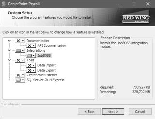 - Select the down-arrow next to JobBOSS, select Entire feature will be installed on local hard drive, and then click Next until the installation begins.