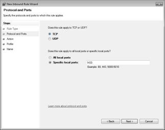 - Select TCP in the first section. Then select Specified local ports and enter 1433. Click Next.