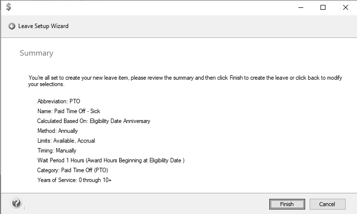 - On the Summary screen, review your selections and then click Finish to create the leave or click back to modify your selections.