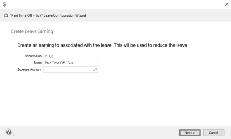 If you selected to create a new earning, on the Create Leave Earning screen, create an earning to associate with the leave. This will be used to reduce the leave balance when the employee uses available hours. Enter an Abbreviation and Name (both boxes will default to the leave being configured), then select the earning's Expense Account.
