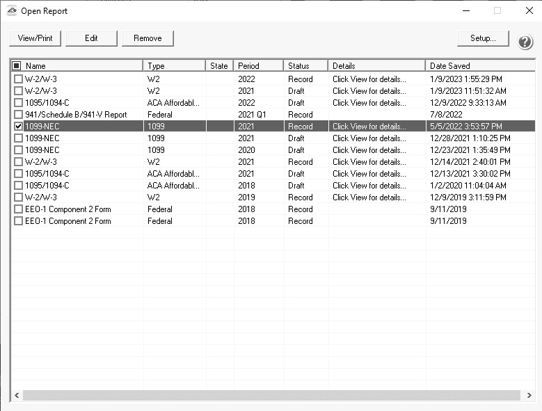 - The 1099 History Options screen displays again. Click Close.