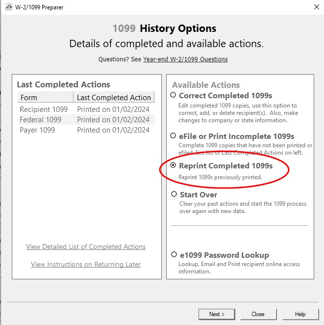 - Choose Reprint Completed 1099s on the right and click Next.