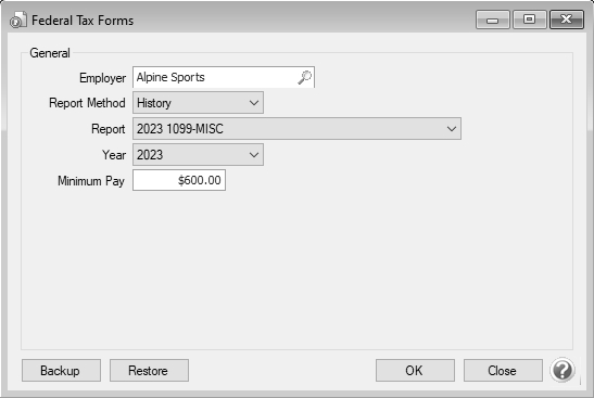 - Select the appropriate Employer. Choose History in the Report Method box. Choose the current year's 1099 form in the Report field and the current year in the Year field.