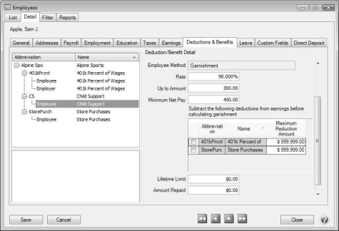 - Select the garnishment from the employees list (upper-left) and click on the Employee line within it. The Deduction/Benefit Detail for this garnishment will be displayed on the right side of the screen.