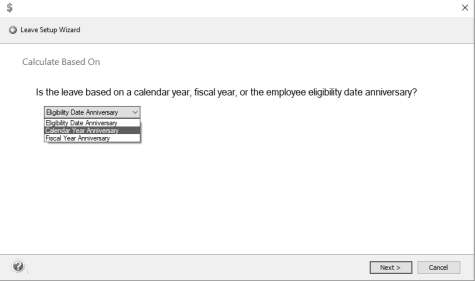 - On the Calculate Based On screen, select if your leave is based on Calendar Year, Fiscal ear, or the Employee Eligibility Date Anniversary. This selection is used to determine the leave balance year, when the year-to-date values are counting from, and when any carry over for a new year is calculated. An employee's Years of Service is always calculated based on Hire Date unless there's a wait period (then it is based on the Wait Period Date) to determine the amount of leave earned from the Leave tables. Click Next.