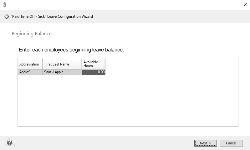 If you selected to enter beginning balances for the employee leave, on the next Beginning Balances screen, in the Available Hours column, enter each employee's beginning leave balance (this column will be formatted the same as the Decimal Places for Hours preference set in File > Preferences > Payroll > General) .