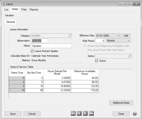 Leave is used to setup specific vacation/leave tables that can be assigned to an employee and used in leave time calculations.The Leave Table defines how much leave should be calculated for each employee based on the leave category and the employee's number of years of service. You may need multiple leave tables for different types of employees.