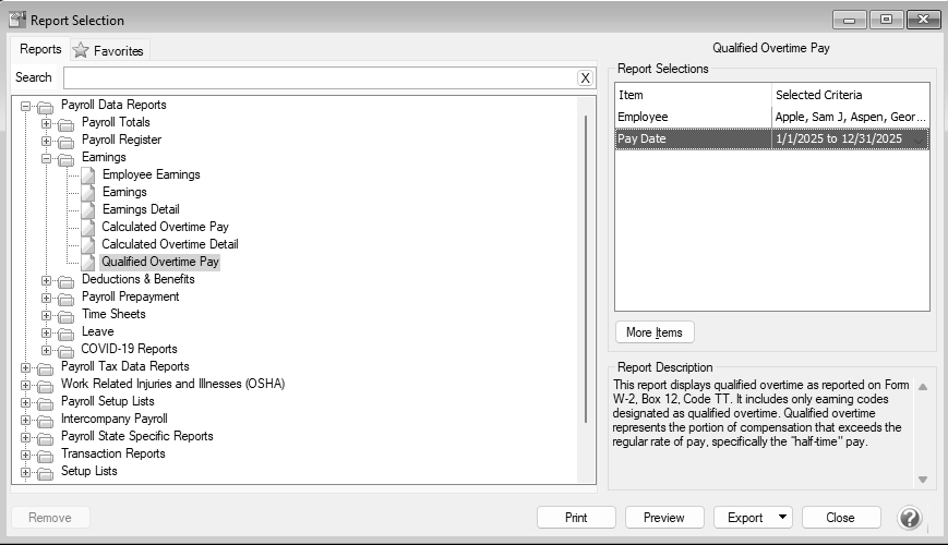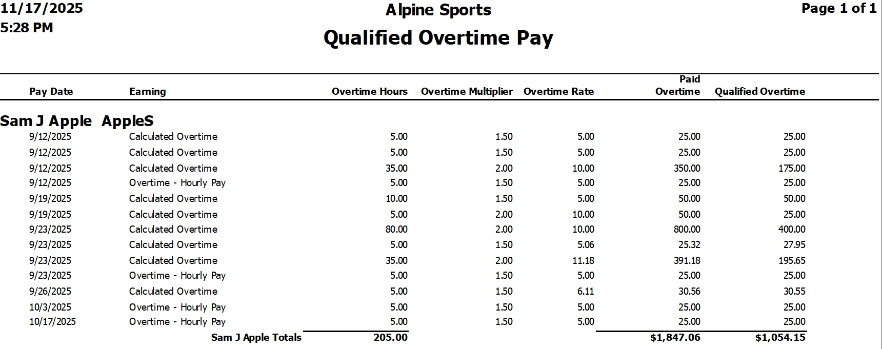 You can use the Qualified Overtime Pay report to reconcile the reported Form W-2 values or to hand out to employees as a supplemental report to show the total to be applied as a deduction on their individual tax return (employees should consult their tax preparer for guidance).