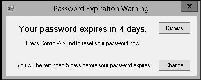 A: Yes, passwords expire every 180 days and five days prior to your password expiration date the Password Expiration Warning screen will display. Press Ctrl+Alt+End to reset your password or click Dismiss and you will be informed each of the five days prior to your password expiration date.