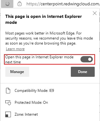 Q: Can I load the Red Wing Cloud Services, in Internet Explorer Compatibility Mode, from my Microsoft Edge toolbar?