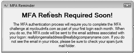 A: Users are required to authenticate their Red Wing Cloud Services account initially and the first time they log in each month at each unique location. User passwords expire every 180 days. If you connect via Option 1, via an internet browser, three days before the account authentication expiration, the following message will display to remind you to authenticate your account. See the How do I authenticate my account and log into the Red Wing Cloud Services? question above.