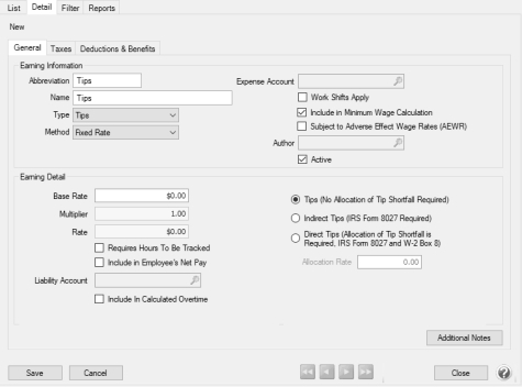 If you use direct tips, the Tip Shortfall Allocation is required. This will calculate a shortfall if the total reported tips are less than the total gross receipts multiplied by the allocation rate entered on the tips earning in Setup > Payroll Details > Earnings. This amount is reported in Box 8 of the W-2 and on employer IRS form 8027.