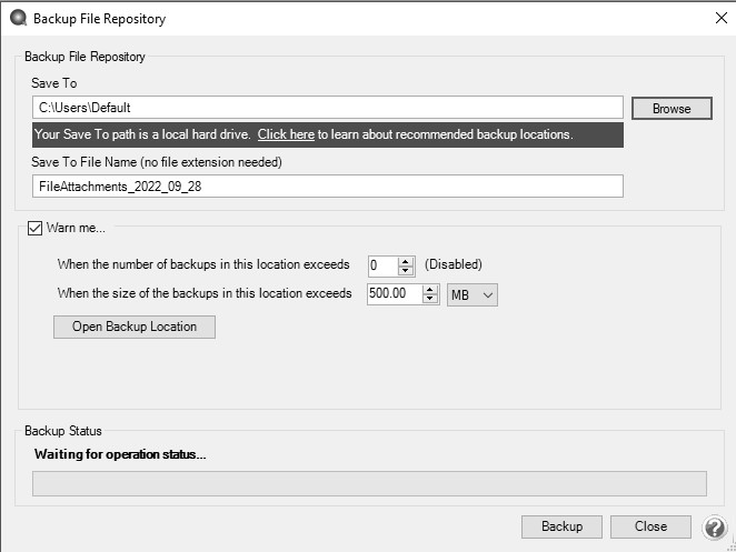 - To view the contents of the Save To backup location, click Open Backup Location.