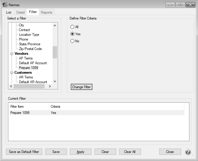 For example, on the Names Setup screen, if you only wanted to see all of the names that you marked to receive 1099s on the List tab: