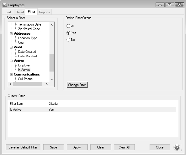 For example, on the Employee Setup screen, if you wanted to see only your active employees on the List tab:
