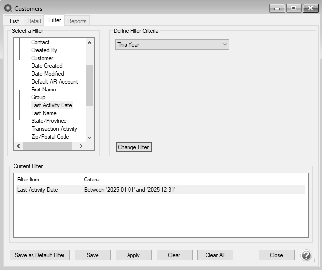 Follow the Filter the Contents of the List tab section to apply your filter to the default List tab. In the example below, the List tab was filtered to display the customers with a Last Activity Date of This Year.