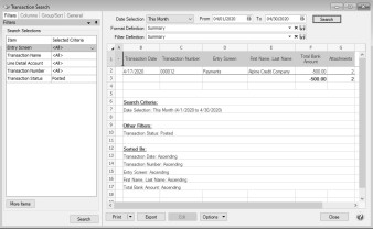 - In the Date Selection or date From/To fields, specify the appropriate date range to search. By default, the Date Selection criteria is set to This Month. To set your selection to display each time you start Transaction Search, right-click and select Set As Default.