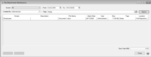With the ability to attach files in CenterPoint, there may be a need to view or delete the documents separately from the transaction or setup screen. The File Attachments Maintenance screen is used to display attachments for specific screens, date range, tags, and user. The attachment can then be viewed or deleted.